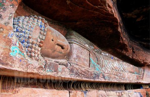 臥佛院摩崖造像位于四川省安岳縣城北面25公里的八廟鄉(xiāng)臥佛溝,以其臥佛大像和石刻佛經(jīng)聞名于世。臥佛鐫刻在距地面5米的崖壁上,全長23米,頭長3米,肩寬3.1米。它 背北面南,頭東足西,左側(cè)而臥。臥佛形體修長,身著袈裟,面部豐盈,神態(tài)安祥,雙目微閉,似睡非睡,展現(xiàn)出釋迦牟尼涅槃時那超脫一切的意境。臥佛溝南面的 石壁上,有15窟經(jīng)龕,規(guī)模大小不等。刻經(jīng)面積達130多平方米,經(jīng)文目錄繁多,內(nèi)容極其豐富。主要經(jīng)目有《大唐東京大敬愛寺一切經(jīng)論目序》、《佛名 經(jīng)》、《大般涅槃經(jīng)》、《般若波羅密多心經(jīng)》、《佛頂尊勝陀羅尼經(jīng)》、《妙法蓮花經(jīng)》等。這裡是我國寶貴的石刻經(jīng)庫。 (資料來源:石工坊雕刻)