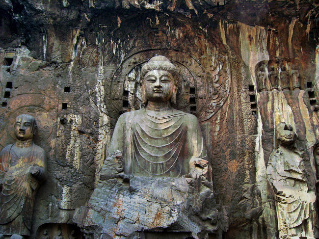 盧舍那大佛造像是河南洛陽龍門石窟造像中的一顆明珠,取材于佛教。眾所周知,佛教由釋迦牟尼創(chuàng)立于古印度,于兩漢之間開始傳入我國,在魏晉南北朝時期得到了初步的繁榮發(fā)展,出現(xiàn)了大量巨大的佛教造像,如云岡大佛等。唐代詩人杜牧《江南春》中的詩句“南朝四百八十寺,多少樓臺煙雨中”,從中可以看出當時佛教的興盛程度。