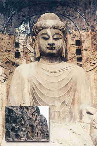 河南洛陽城南的龍門石窟,力經(jīng)東魏、北齊、隋、唐多個朝代之開鑿,作品龐雜,遺留作品也較多??上У氖?解放前被外國列強(qiáng)盜去了許多造像以及頭、手臂等局部,造成了無法挽回的損失。賓陽中洞是龍門石窟中比較重要的一處,是北朝時期有史實可查的,其形制結(jié)構(gòu)與云岡曇曜五窟相似,窟內(nèi)飾有蓮花、飛天、云氣等圖案,氣氛神秘、紋飾華麗,但無瑣碎之感;蓮花洞內(nèi)的石雕蓮花特別突出,窟內(nèi)主佛像為站立姿勢,手臂的雕刻尤為動人,,似有柔軟彈性之感;古陽洞是龍門石窟中較大的一個,歷史年代也較早,最有代表性的是在洞內(nèi)壁面上雕滿了小佛龕,幾乎每龕都有造像題記,中國著名的書法碑帖“龍門二十品”中,古陽洞中的就有十九品。