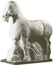漢代是中國封建社會中最具魄力的一個時期,自秦朝統(tǒng)一中國,一直在盛衰變化中持續(xù)了四百余年。漢風(fēng)氣勢,我們可以從現(xiàn)存的雕塑清楚的看到。如西漢霍去病墓,至今還存有一批杰出的石雕藝術(shù)作品,它們是為紀(jì)念西漢名將霍去病而創(chuàng)作制造的?!榜R踏匈奴”高190厘米,作者用隱喻的手法,借戰(zhàn)馬的形象來體現(xiàn)霍去病的威猛和戰(zhàn)功卓著,充分體現(xiàn)出紀(jì)念性雕塑的概括性。整個雕塑渾然一體,四肢之間沒留空間,增強(qiáng)了體、量的沉重感。