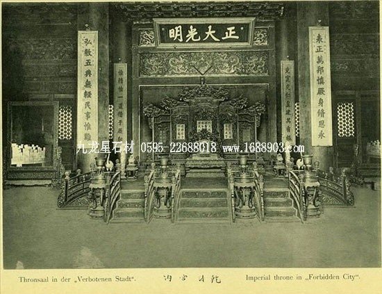 太和殿內(nèi)的主要陳設(shè)還有皇帝的寶座,寶座前設(shè)腳踏及香筒、甪端、仙鶴、寶象等。陛間陳設(shè)香爐。殿內(nèi)墁地金磚是專門為皇宮燒制的細(xì)料方磚。之所以叫金磚是因?yàn)檫@種磚質(zhì)地細(xì)密,敲之有金石之聲,故名。