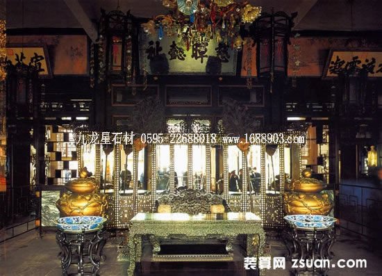 屋頂安置藻井,藻井又稱天井、龍井、井內(nèi)中心雕蟠龍俯首下視,龍口銜寶珠。人稱軒轅鏡,以示下面寶座上的皇帝為軒轅子孫正統(tǒng)嫡脈。藻井的設(shè)置主要是起烘托帝王尊嚴(yán)的作用,此外還有鎮(zhèn)火的含義。