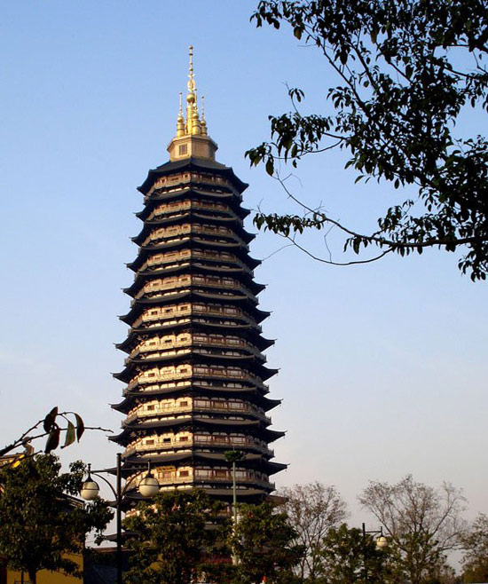 天寧寶塔乃中華第一佛塔(全球最高佛塔)位于江蘇省常州市天寧寺內(nèi)。天寧寶塔始建于2002年4月,于2007年4月30日開光。總建面積2.7萬平方米,塔高13層153.79米,為國(guó)內(nèi)4000多座寶塔之最;從底層地宮到頂層鐘樓,整座寶塔以佛教文化為主線,以東陽木雕、揚(yáng)州漆器、常州亂針繡、惠安石雕等手工藝術(shù)為表現(xiàn)手法,巧妙地詮釋了大乘佛教的諸多教義。佛塔的建成,與北方云崗大佛、中原龍門大佛、西方樂山大佛、東方靈山大佛、南方香港天壇大佛遙相呼應(yīng),成為五方五佛的佛心。