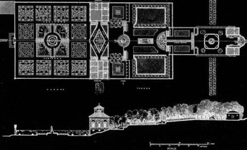 莊園坐落在向北的緩坡山腰處,四周圍墻將其與園外的林地分開。整座莊園成長方形,長約240m,寬約75m,高差約為5m,由四層臺地組成,構成四個方形單元空間。一層臺地園路為石鋪道路,并以大面積花壇布置;二層臺地建筑物占據(jù)一半以上面積,而三層臺階植被為大型喬木,搭配圓形水池,四層有大面積草地。各臺地均以臺階連接水景過渡,綠籬成為重要的分隔物,將園內(nèi)外以及園內(nèi)各空間分割開。