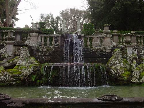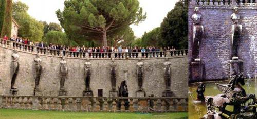 噴泉:蒙塔爾托主教入主別墅時期,他按照當年維尼奧拉的整體設計,繼續(xù)建造花園的中央噴泉--意大利風格主義雕塑家詹博洛尼亞(1529-1608)設計建造的"摩爾噴泉":4個石欄圍繞的水池,石欄上矗立著石雕花瓶,4個水池中央便是一組高聳的年輕運動員的輝煌雕塑,他們高高舉起象征著蒙塔爾托主教家族姓氏的"阿爾托山"。從遠處看去,這些有力的塑像十分宏大,黑黝黝地閃耀,以至于人們會認為它們是青銅,可是難以置信的是,它們是最好的、最堅硬的石灰華在陽光與水的作用下生成的一種堅硬如鐵的物質(zhì)。后來意大利新古典主義雕塑大師卡諾瓦來到這里時,大為驚訝,他一邊拿起錘子輕輕敲打著它,一邊發(fā)出如此的感嘆:"它將比大理石更長久"。