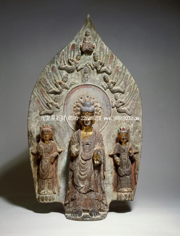 4至6世紀(jì)的南北朝是中國(guó)佛教造像的啟蒙和黃金時(shí)代,尤以制作精美的北朝造像聞名于世。北魏晚期佛像造型已顯成規(guī),表現(xiàn)為軀體趨平板狀,線(xiàn)條概括、洗練,又富裝飾性,加上長(zhǎng)眉、細(xì)眼及抿唇微笑的臉相,洋溢著一種既莊嚴(yán)又清秀的審美品味。館藏的佛三尊立像是這一時(shí)期造像碑作品的典范。