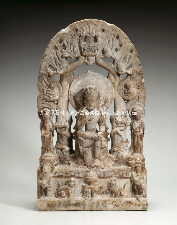 館藏思維彌勒像雖運(yùn)用成規(guī)的造像碑格式和構(gòu)圖,但設(shè)計(jì)制作別具一格。用鏤空技法雕出一庭園背景,為白色的大理石作品更增添了一種清新和輕盈的視覺(jué)效果。彌勒左腳踩蓮座,半跏趺坐于兩棵大樹(shù)之間。樹(shù)干有龍盤(pán)繞,兩樹(shù)枝葉相纏構(gòu)成圓拱形背屏,又有四飛天簇?fù)硪环剿谥醒?。這些細(xì)節(jié)是彌勒經(jīng)典形象的描繪,彌勒在龍華樹(shù)下成佛,方塔即釋迦牟尼的舍利塔。蓮座和方塔象征彌勒是釋迦佛的繼承人。彌勒臉形方圓,戴頭冠和瓔珞,軀干和四肢分明,肩臂圓潤(rùn),薄裙貼體。兩旁有脅侍菩薩,腹部前凸,一腿側(cè)立,膝蓋略彎,作稍息站勢(shì),開(kāi)啟了后代菩薩形體造型的新風(fēng)尚。人物造型是漢化和受印度笈多佛雕(Gupta)風(fēng)格影響的產(chǎn)物。此尊造像是北齊時(shí)期題材和雕刻巧妙結(jié)合的典范。