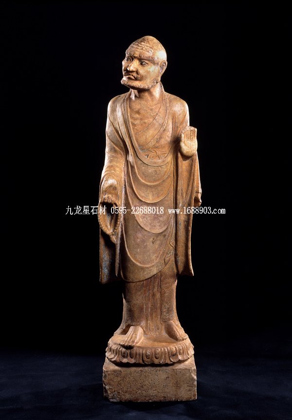 佛史上有十六、十八或五百羅漢之說(shuō),他們也是跟隨釋迦牟尼聽(tīng)法傳道的眾弟子,所以,羅漢造像多為世俗和尚們言行舉止的寫(xiě)照。館藏的金代羅漢像在相貌和形體上是一位惟妙惟肖的胡僧。羅漢內(nèi)穿僧祇支,外罩袈裟,衣裝的層次結(jié)構(gòu)刻畫(huà)得細(xì)致分明。衣質(zhì)輕薄,透出瘦削的體格,胸部突出的肋骨清晰可見(jiàn)。衣紋的曲直轉(zhuǎn)折既寫(xiě)實(shí)又富裝飾性,前面的一組平行弧線(xiàn)由上至下遞增,富有節(jié)奏感,和垂直的形體構(gòu)成和諧對(duì)比。羅漢的頭顱呈圓錐形高聳,象征已得盡智。臉相清癯,高鼻,深目,顴骨凸出,卷曲的眉毛、胡須栩栩如生。羅漢微微側(cè)頭,似乎正在神情專(zhuān)注地聆聽(tīng)著什么。造型設(shè)計(jì)抓住這種一剎那的動(dòng)感,給本來(lái)靜態(tài)的立像增添了許多生氣。羅漢像的背面也有寫(xiě)實(shí)的形體和衣紋描繪,吻合此像為三維空間之作的創(chuàng)意。這尊石像,雕工純熟精湛,人物形神皆備,實(shí)為宋金時(shí)代中國(guó)羅漢像的代表作。