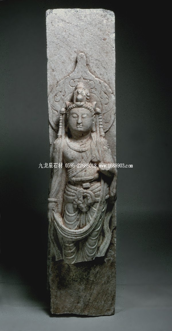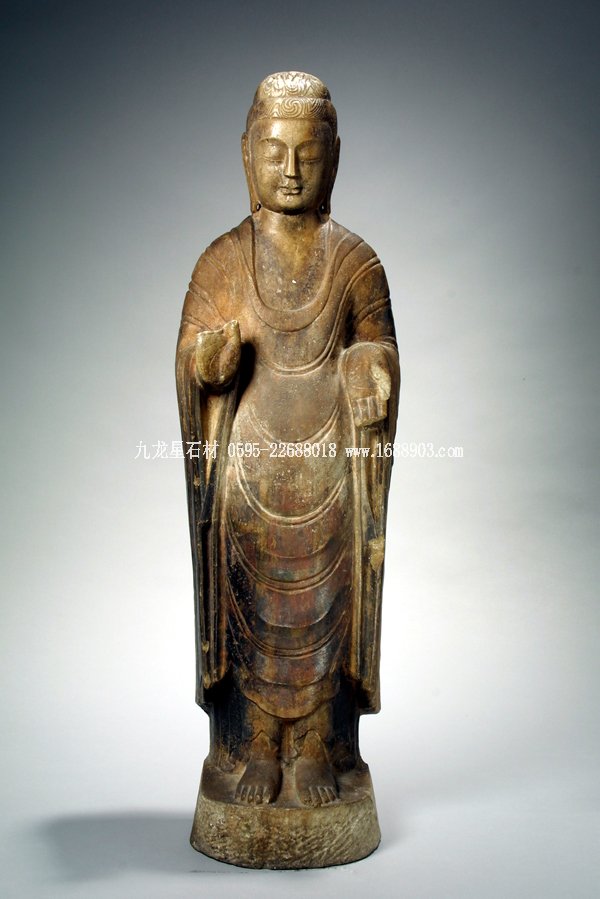 20世紀(jì)50年代在河北省曲陽(yáng)縣修德寺發(fā)掘出兩千余尊石造像,其中多有北齊和隋朝的紀(jì)年造像。曲陽(yáng)(古屬定州)一帶盛產(chǎn)大理石,在6世紀(jì)時(shí)已是佛像制作中心之一,至今仍有“雕刻之鄉(xiāng)”的稱(chēng)謂。館藏思維彌勒像和立佛像,從材質(zhì)和風(fēng)格來(lái)看,應(yīng)歸屬于同時(shí)代的當(dāng)?shù)刈髌?。立佛像身軀雖然仍較扁平,但總體輪廓線(xiàn)圓潤(rùn),腹部微向前凸起,增添了視覺(jué)上的體積感。佛著通肩袈裟,衣薄貼體,U形衣紋用雙鉤陰線(xiàn),平行下垂的間距遞減,富有節(jié)奏感,為同類(lèi)作品所罕見(jiàn)。佛左手施與愿印,右手施無(wú)畏印,有漩渦發(fā)型,高肉髻,臉形方圓,面容親切,是北齊佛像的精品。