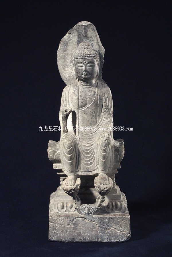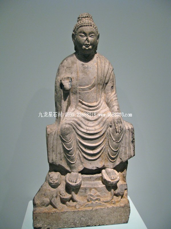 從北齊開(kāi)始,中國(guó)石雕佛像趨向肢體、衣飾質(zhì)感的細(xì)節(jié)刻畫(huà)。至8世紀(jì)的唐代,佛像造型越顯自然寫(xiě)實(shí),雕刻技法精湛,從而形成中國(guó)式佛像的模式。館藏的兩尊彌勒佛堪稱(chēng)初唐時(shí)期的佳作。未來(lái)佛彌勒在形態(tài)塑造上與釋迦佛幾乎無(wú)異,不同之處在于彌勒佛的坐姿和手勢(shì)。彌勒佛不是盤(pán)腿結(jié)跏趺坐而是倚坐,即雙腳下垂踩蓮花。其手勢(shì)基本上有兩種:一種同交腳彌勒菩薩的手勢(shì),左手握衣角,按左膝,右手作無(wú)畏或說(shuō)法印;另一種是一手心向下按膝,一手作無(wú)畏或說(shuō)法印。這兩尊彌勒佛方額廣頤,臉頰豐滿(mǎn),衣裟透體,衣紋刻畫(huà)生動(dòng)流暢。整體造型嚴(yán)整自然,神態(tài)顯得平易安詳。