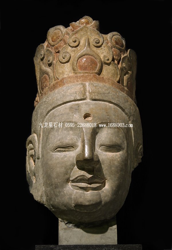 大勢(shì)至是西方極樂(lè)世界阿彌陀佛的右脅侍菩薩,和左脅侍觀(guān)音菩薩及阿彌陀佛,合稱(chēng)“西方三圣”。大勢(shì)至的形象,多是頭戴寶冠,冠中有寶瓶。館藏的北齊大勢(shì)至菩薩臉型圓潤(rùn),豐唇滿(mǎn)頰。大拱形彎眉之下是細(xì)長(zhǎng)的雙眼,用細(xì)線(xiàn)勾出雙層上眼瞼,抿嘴輕笑,又刻意雕出豐實(shí)的下巴。這些獨(dú)特的造型和技法與河北省響堂山石窟的同時(shí)代造像完全相同,應(yīng)是原屬于該窟的造像。頭像神態(tài)自信怡然,制作相當(dāng)精美,是北齊石雕像中的佼佼者。