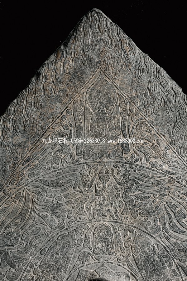石碑正面雕一佛二菩薩,菩薩腳邊有護(hù)法獅子,現(xiàn)只剩殘?bào)w。佛和菩薩面相清瘦,身軀修長(zhǎng),頭部和手腳近似圓雕,佛裝則以高淺浮雕展示不同層次。如佛身上的漢化褒衣博帶式袈裟和衣裙腳部重疊衣褶的造型。他們身后是火焰形大背光,上面用減地陽(yáng)刻和陰刻手法由中心向外畫(huà)出五個(gè)裝飾圈。中心圈是佛的頭光,內(nèi)有蓮花瓣;旁圈里是過(guò)去七佛;再外圈有六身飛天環(huán)繞,上部有一人形神獸頂一香爐,飛天或持蓮苞、香熏和樂(lè)器,姿態(tài)飄逸清揚(yáng);在此圈的尖頭部分又畫(huà)出第四圈,內(nèi)含一佛像,禪定趺坐于蓮花寶座上,側(cè)脅兩個(gè)飛天;最外圈是飛動(dòng)的火焰圖案。