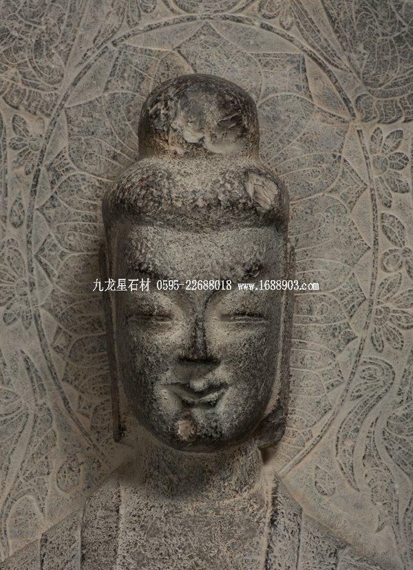 河南龍門(mén)石窟的擂鼓臺(tái)三洞建于武周和盛唐時(shí)期。館藏的佛頭像原屬其一洞窟中的大佛。佛有漩渦發(fā)型,高肉髻,臉龐圓潤(rùn)飽滿(mǎn),眼呈俯視之態(tài),眼瞼微合,眼珠點(diǎn)黑彩,神態(tài)自信沉著。根據(jù)頭像的碩大尺寸可知原大佛應(yīng)高高在上。由此,若從仰視的角度再看這尊頭像,佛的容顏就變得更溫和親切,實(shí)可為原設(shè)計(jì)之本意。獨(dú)特的創(chuàng)意和純熟的雕刻技法,是盛唐造像得以具備高度寫(xiě)實(shí)性和表現(xiàn)性的原因。