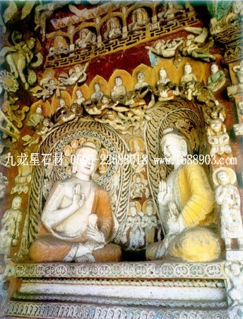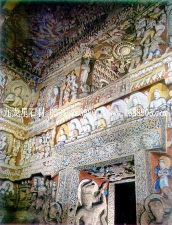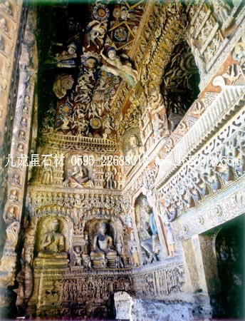 石窟位于山西省大同市西北的武州山北崖上,是我國三大石窟之一,距今已有1500多年的歷史。整個石窟依山開鑿,東西綿延1公里,現(xiàn)存主要洞窟53個,大小造像51000多個。石窟雕刻的題材內(nèi)容,基本上是佛像和佛教故事。石窟中最大的佛像是第五窟三世佛的中央坐像,高達(dá)17米。佛像形態(tài)端莊,是中原文化傳統(tǒng)的表現(xiàn)手法,但其臉部形象:額寬、鼻高、眼大而唇薄,卻具有外域佛教文化的某些特征。