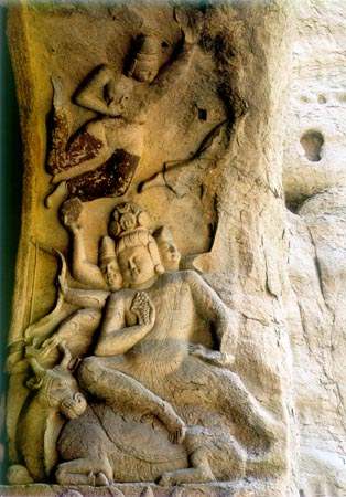 最饒有趣味的是第八窟拱門東側(cè)雕刻的摩醯首羅天和西側(cè)的鴻摩羅天,一個騎神牛三頭八臂,一個乘神鳥五頭六臂。這一組新奇神異的浮雕,不再是生命的寫實,而是精神的寫意。游牧民族用審美的藝術(shù)形象折射生命現(xiàn)象中的“多頭多臂”,內(nèi)化為人類幻想生長出更多的智慧頭腦和勇敢的手臂,去征服自然,以獲得自身生命的拓展與延伸。