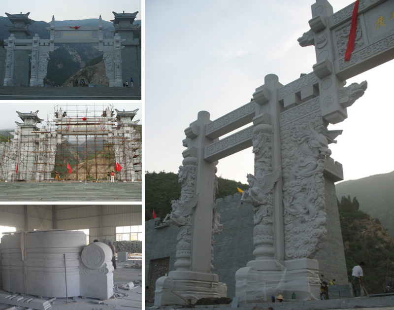 黃羊山大牌坊位于河北省涿鹿縣黃羊山國(guó)家公園,黃羊山大牌坊以中國(guó)傳統(tǒng)元素、龍及中華吉祥圖騰作為元素設(shè)計(jì)加工制作而成,整座牌坊高15米,寬25.4米,采用芝麻灰花崗巖整石制作,牌坊連接拼裝為傳統(tǒng)石卯榫結(jié)構(gòu),最大單塊重量60噸左右,加工,運(yùn)輸,安裝難度極大,云峰公司克服了設(shè)計(jì),制作,運(yùn)輸,安裝等種種困難因素制作而成,使其成為石牌坊中的經(jīng)典工程。