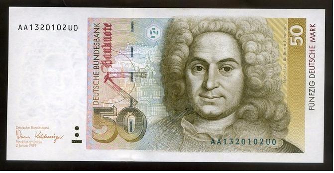 諾依曼是18世紀(jì)巴洛克建筑師,他的肖像和最杰出的作品之一,奢華的維爾茨堡住宅,于1991-2002年間一起出現(xiàn)在德國50歐的紙幣上。