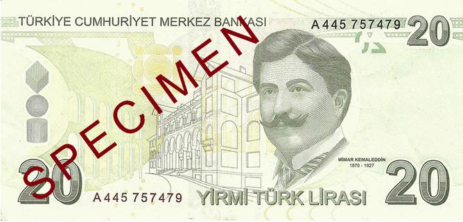卡梅雷丁是奧斯曼晚期著名的土耳其建筑師,將傳統(tǒng)的奧斯曼與歐洲風(fēng)格相結(jié)合?,F(xiàn)行的20里拉紙幣背面印有卡梅雷丁和他主要的作品之一,安卡拉Gazi大學(xué)(Gazi University in Ankara)。