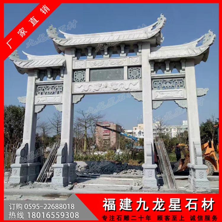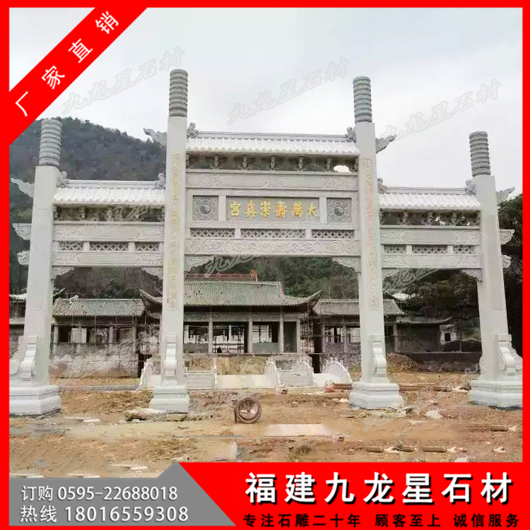 第二:牌坊大小,大型牌坊也有大小之分,筆者見過最大的牌坊高達6米,左右寬12米,深3米,整座牌坊完全采用立柱搭建,造型別致,精妙絕倫,這樣的大型牌坊價格是非常高的,當(dāng)時聽聞,需要幾千萬制作而成。但是普通的三門牌坊也可以稱之為大型牌坊,價格不過幾萬到十幾萬也非常多。主要是越大的作品,需要加工的工藝和使用的石料都會增加,并且后續(xù)的運輸,安裝也會非常的繁瑣導(dǎo)致的。
