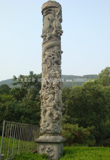 青石九龍柱塑有纏柱云龍,柱上橫貫一塊美麗的云板,好似行云插入云際。頂端承露盤上的蹲獸,栩栩如生。素有吉祥、華貴、誠信等意,是單位公司、家居、辦公裝飾、園林觀賞、饋贈等之佳品!立在廣場路邊成為景觀和地標(biāo) ...