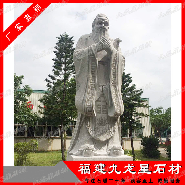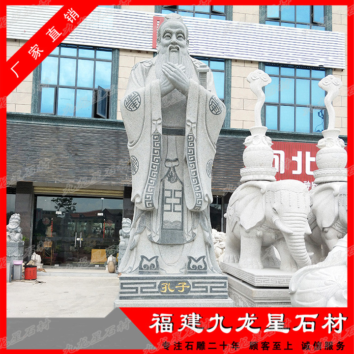 孔子石雕像樣式選擇性不算太大,現(xiàn)在我們看到的孔子形象大多是根據(jù)唐朝的吳道子所畫的孔子像來進行創(chuàng)作雕刻的,長眉長須,身著寬大的儒服,衣袂飄飄,栩栩如生,因此非常考驗雕刻師傅的工藝,達到石雕像的真實感,表情惟妙惟肖。一般比較常見的孔子石雕像有比較簡單的頭像,也有站姿的石雕像,基本上站立姿勢的石雕像選擇性更受到人們喜愛,有手里握著書卷拿在胸前,一手背在身后,抬頭挺胸,眼神眺望的石像,也有將雙手交叉并在胸前,但是我們可以看到交疊的手是不露出大拇指的,象征著謙恭有禮,而四指并攏,也代表著四海之內(nèi)皆兄弟,有著友愛、友誼的象征意義。