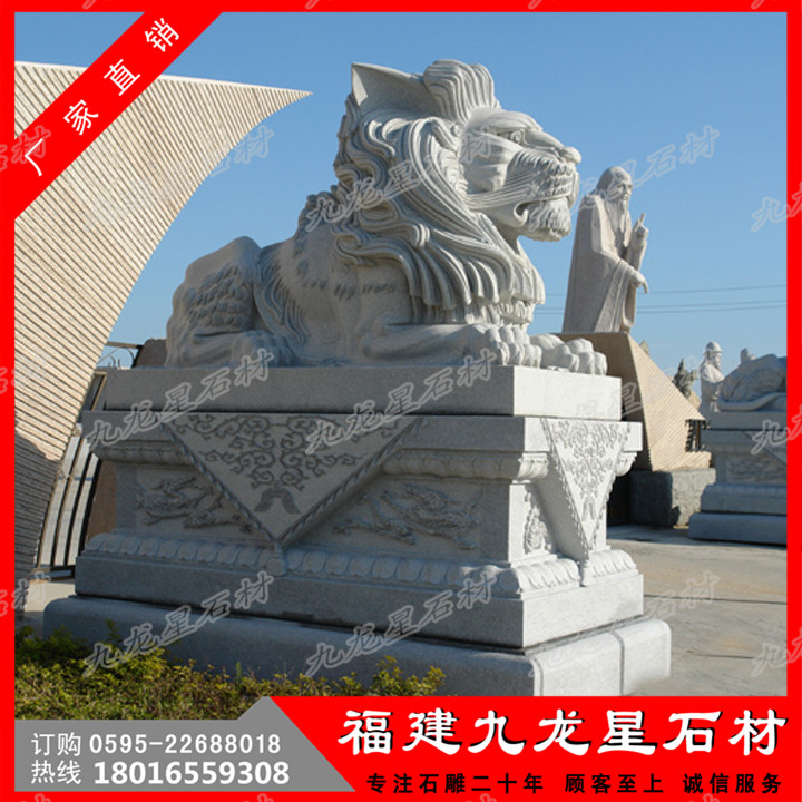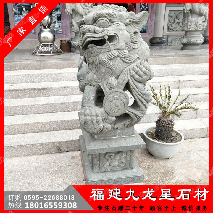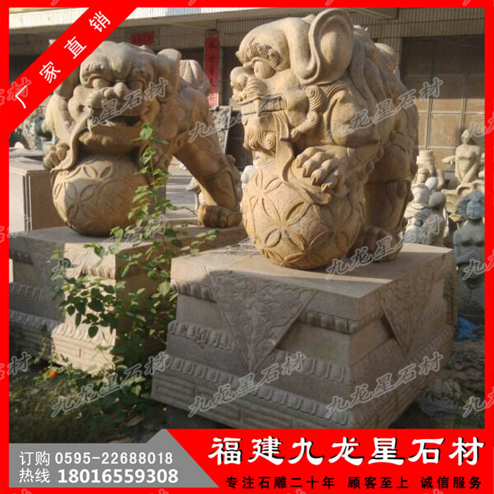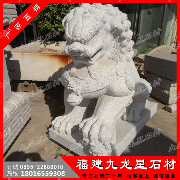 石雕動(dòng)物獅子的腦門(mén)寬闊隆起,天庭飽滿,下頜裂開(kāi),地閣方圓.眼窩深,眼球鼓,鼻根深陷,張嘴似欲吞欲笑,多呈憨態(tài).毛發(fā)呈卷曲紐狀,自然地附著頸項(xiàng)部,更顯得威而不怒,猛而不殘.石獅有雌雄兩種:雄獅口含圓珠,耳呈葉狀,兩邊超過(guò)卷毛高度,毛發(fā)卷曲很有規(guī)律,布滿了耳、頸部。有時(shí)腳蹬繡球,表示其性貪玩耍.而雌獅身上多背小石獅子,或足下踩小石獅,表示一種"母愛(ài)",很有情趣,一般情況下,門(mén)左置雄獅,門(mén)右置雌獅。